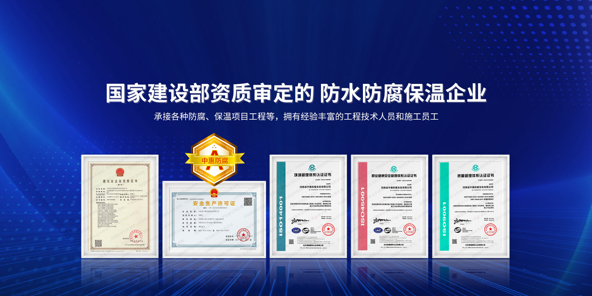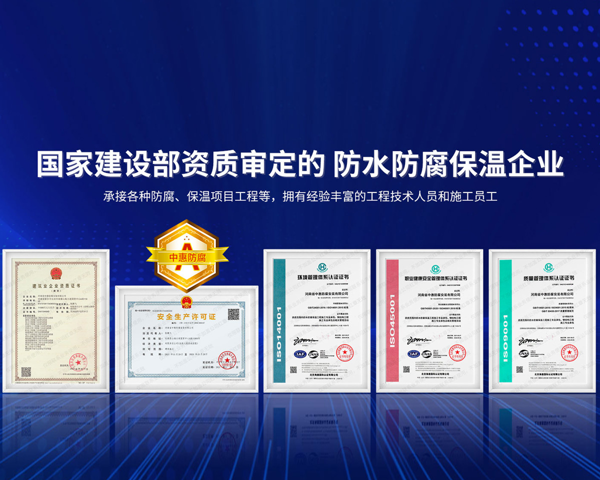 公司經營范圍:防水防腐保溫工程;消防設施工程;建筑裝修裝飾工程;建筑機電安裝工程;電力工程;建筑工程;石油化工工程;工業清洗工程;油罐清洗工程;鋼結構工程;環保工程;模板腳手架工程;電纜防火封堵、防污閃噴涂、外墻外保溫工程;各類施工勞務作業;設備維修、船舶鉚焊、涂裝;電力工程材料、建材、防水材料、防火材料、防腐保溫材料銷售,并相繼通過了GB/T19001-2008idtISO9001:2008GB/T50430-2007質量管理體系認證證書。GB/T24001-2004idtISO14001:2004環境管理體系認證證書。GB/T28001-2011idtOHSAS18001:2007職業健康安全管理體系認證證書。公司是中國防腐蝕于防護協會、中國施工企業管理協會、電力協會和中國鋼結構防水協會會員單位。 公司的經營業務涵蓋了石油、化工、電力、冶金、煤炭、船舶、國防、燃氣、水利、環保、交通運輸、航空及國防軍工和輕紡市政等行業的防腐保溫絕熱設備。鋼結構安裝、防火、防水、金屬噴鍍、聚脲噴繪、陰極保護、防滲透堵漏、玻璃鋼及各種磚版材料襯里、橡膠襯里、煙氣硫和耐酸溶劑腐蝕等工程施工。公司連續十年榮獲“省市先進施工企業”“安全生產先進單位”“重合同,守信用企業”和“AA***資質企業”的稱號。2000年被命名為市級文明單位,2002年被國家工商行政管理局命名為“重合同,守信用的企業”、被中國工業防腐蝕技術協會命名為“防腐蝕企業,能源節約及環境保護領域有豐富的經驗和***的業績。工程一次交驗合格率100%。其中攀枝花鋼鐵公司煉鐵廠四號高爐及熱風爐防腐工程、上海寶鋼公司煤氣柜防腐工程、撫順石油一廠裝置防腐項目、齊魯石化公司稀烴廠高塔防腐工程、吉林化學工業公司煉油廠油罐防腐工程、天津石化熱電廠六號爐頂棚聯絡管保溫工程、大慶油田(太倉)力神泵業工程、中國化學工程第十一建設工程、中原油田勘探局工程、中國石化銷售有限公司華北分部、魯皖輸油管道工程、貴州開磷息烽合成氨工程、陜西黃陵煤化工程、中國石油天然氣西部管道塔里木輸油工程、邯鋼集團邯寶鋼鐵公司煉鐵工程、德州供電工程、吉寶(南通)船廠工程,偃師華潤熱力工程、鄭州熱力總公司。 河南省中惠防腐安裝有限公司愿以豐富的施工經驗,***的技術,***的設備,***的管理,***的服務,竭誠為國內外廣大的用戶提供***滿意、******的工程作品。 我公司愿與國內外同仁一道,團結協作,共同推進防腐蝕行業發展! 公司地址:河南省長垣縣建設路北段360號 固定電話:0373-8866488 郵編:453400 網址:http://www_zhff_com_cn.hhghq.com